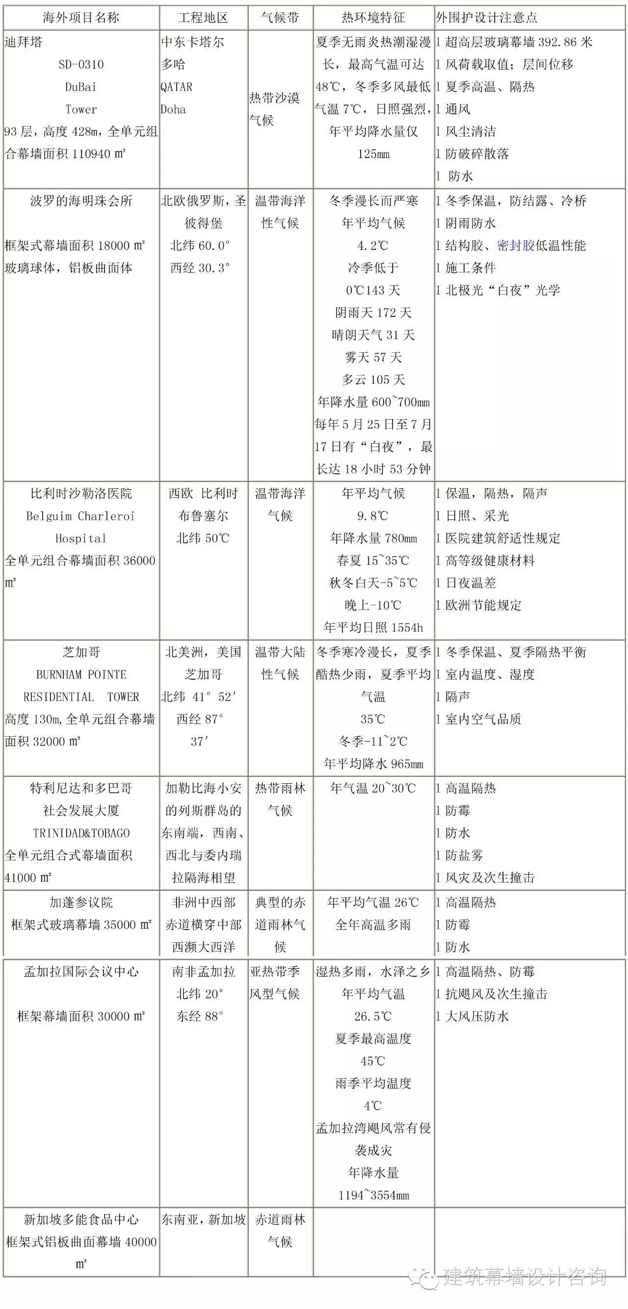 美特幕墙承接海外工程,设计时除获得海外建筑设计提供的气象条件功能要求外,非常注重各个项目所在地的气候特征及幕墙材料、结构、构造上的针对性。(附表1) 比如,孟加拉国际会议中心,特别考虑了亚热带季风气候,高温湿热多雨,常有孟加拉湾飓风侵袭成灾的情况,对飓风破坏玻璃幕墙的特性尚知之甚少。俄罗斯圣彼得堡波罗的海明珠会所,强调了高纬度冬季漫长而严寒,且阴雨天长达172天。结构胶、防水胶条的抗冻性,硬化状况、冬季结露、冷桥、施工条件选择等。多哈迪拜塔则突出了热带沙漠气候,393米超高层玻璃幕墙的风荷载取值,日照强烈、夏季最高气温达48℃、墙面隔热、结构胶受热流淌、雨量稀少风尘清洁等状况。特利尼达和多巴哥社会发展大厦,地处加勒比海小安的列斯群岛,属热带雨林气候,幕墙在抗风、高温隔热、防水、盐雾、防霉的特点。