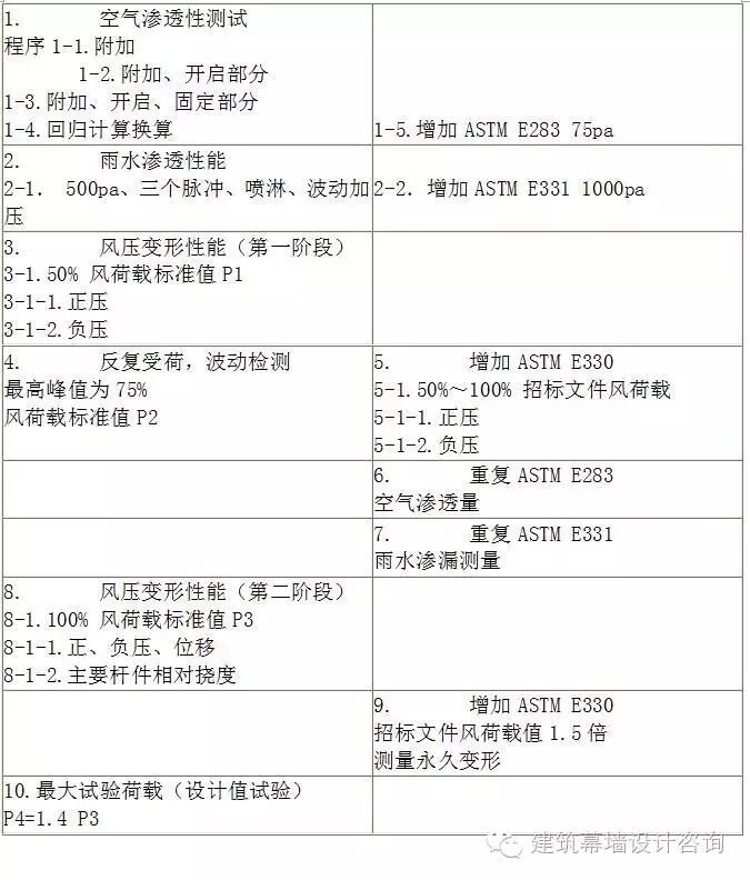由上面程序分析可看出,气密性增加(1-5)水密性增加(2-2),特别在反复荷载波动检测风压变形(程序4)后,增加50~100%招标文件风荷载(程序5),再进行一次气密性(程序6)、水密性(程序7)测量;在100%风荷载标准值P3检测后(程序8),又增加2次1.5倍招标文件风荷载值的永久变形测量(程序9)。这些对气密性、水密性功能指标更为接近实际和安全。