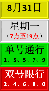 8月31日我市正式开始施行机动车(含临时车牌、外地车牌)单双号限行交通管理措施。措施施行首日为单日,即车牌尾号为单号的车辆通行,禁行双号车辆。