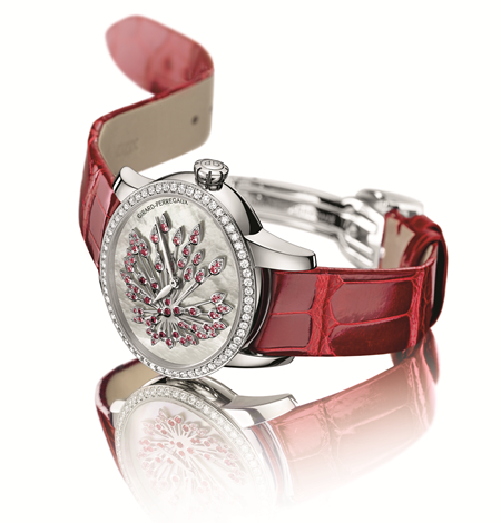 今年恰逢这个系列推出满十周年,自然也准备了周年纪念款。表盘上,宝石铺排以9时位为中心点如光束般向外散射,不对称布局与椭圆表壳线条微妙呼应,长短不一线条光采流溢,梨形尖端向外发放,内镶一颗或两颗宝石,宝石手工打磨效果尤其到家。这款表尺寸35.44 x 30.44毫米,属于女表中偏大的表款,需要佩戴者有相当的女性气场。
