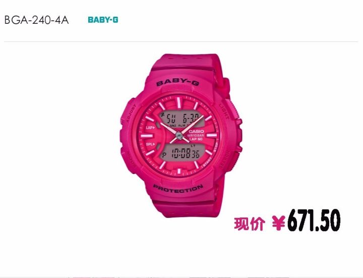 BABY-G BABY-G是卡西欧手表旗下的女款手表品牌,其腕表沿袭G-SHOCK坚韧强悍的Toughness精神,防震、防水功能增添使用灵活性,色彩绚丽。不论是前侧的保护构造,还是侧面的按键设计,都可以达到防震效果。有时可爱,有时很酷, BABY-G将继续为有个性的、崇尚自由的女性提供创新功能和时尚体验。将街头潮流文化与女生热爱的时尚元素揉和于一身,BABY-G以Tough、Cool的形象在潮流圈内深受热捧