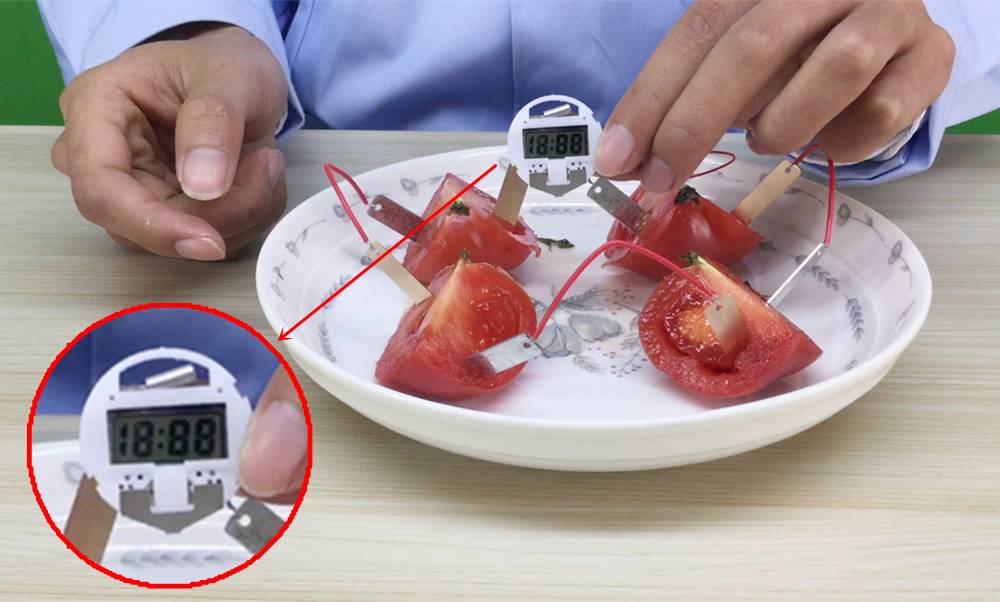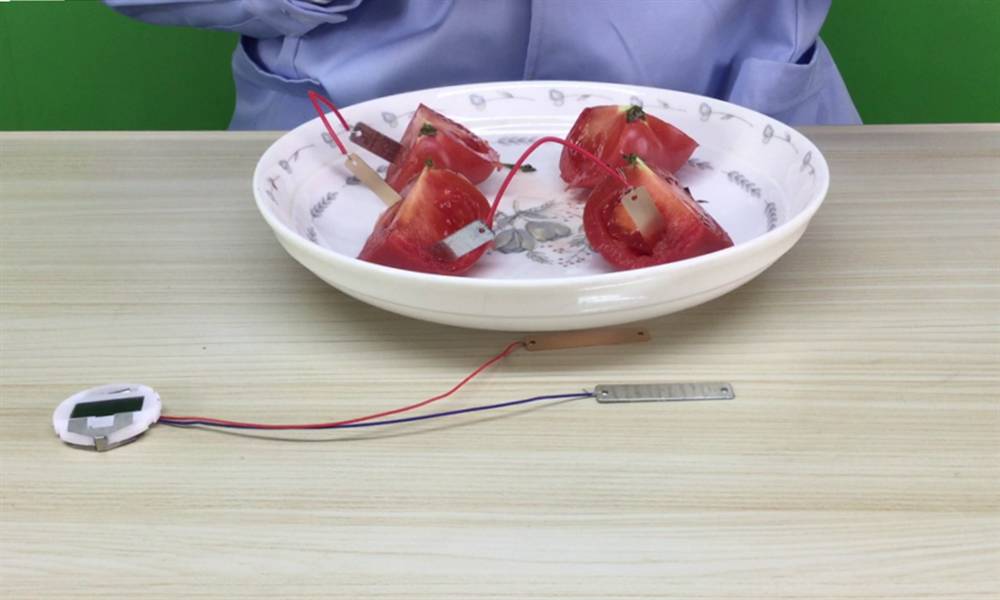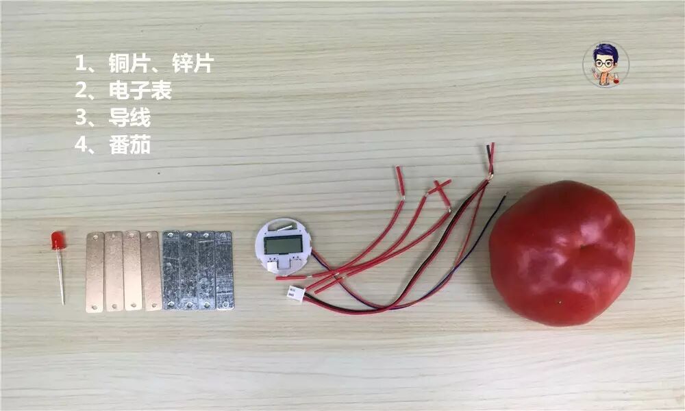 你需要准备的材料有:铜片和锌片,电子表,还有导线;另加1个番茄,还可以是柠檬,菠萝等![]()