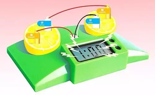 水果电池虽然很好玩,但是原理啊,真还不是小孩一下子能懂的。水果中含有大量的水果酸(C6H8O6 维生素C),是一种很好的电解质。当 插入铜片和锌片时,它们之间会有电压,这就是水果电池。