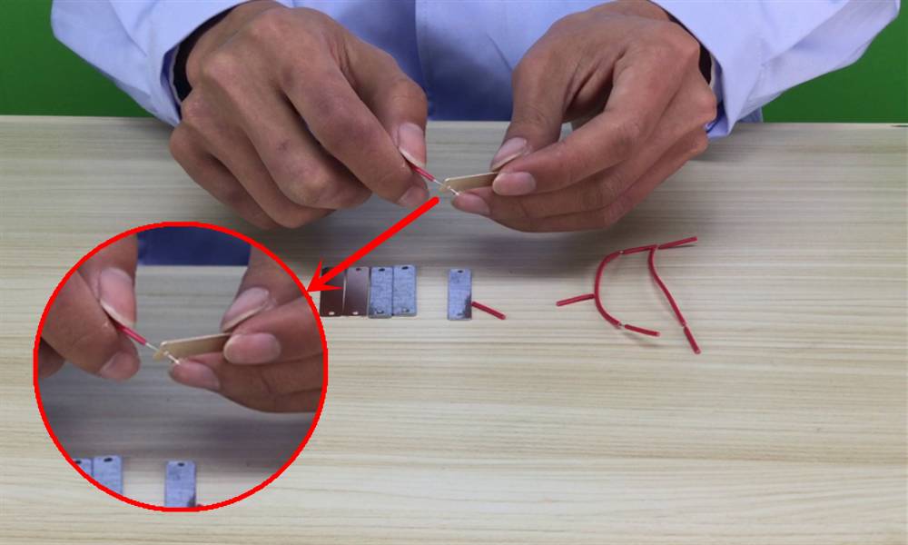 1、用导线穿过铜片上方的小孔,并固定住~ ![]()