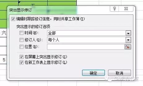 6、修改完成后,保存工作簿。进入"菜单栏——审阅——修订——突出显示修订(H)",按照如下勾选内容,点击确定。