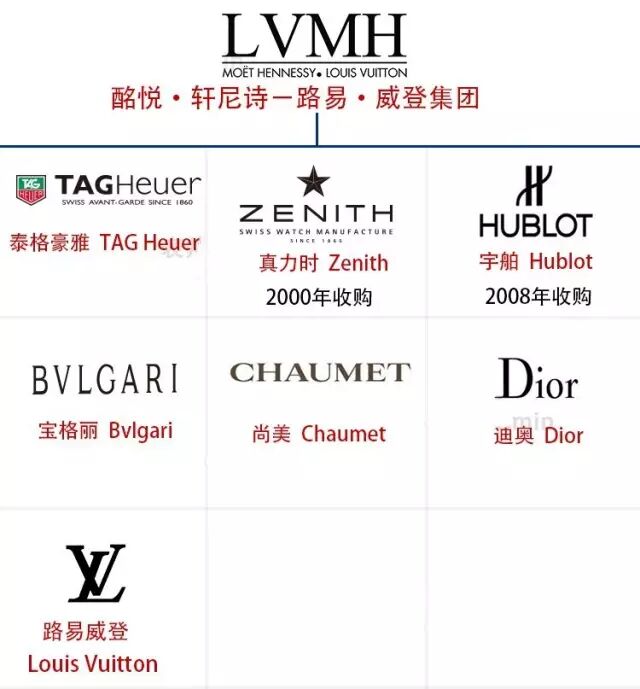 全球最大的奢侈品集团,LVMH集团由路易威登(Louis Vuitton)与酒业家族酩悦轩尼诗(Moët Hennessy)于1987年合并而成。除了卖皮具、酒类之外,集团还涉及服装、零售、出版物,当然也包括钟表。不过,钟表不算主业,销售总额只能排名第四。
