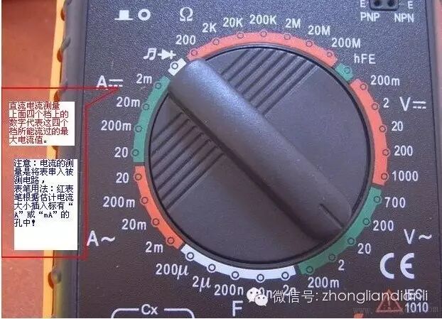 1、直流电流的测量。先将黑表笔插入“COM”孔。若测量大于200mA的电流,则要将红表笔插入“10A”插孔并将旋钮打到直流“10A”档;若测量小于200mA的电流,则将红表笔插入“200mA”插孔,将旋钮打到直流200mA以内的合适量程。调整好后,就可以测量了。将万用表串进电路中,保持稳定,即可读数。若显示为“1.”,那么就要加大量程;如果在数值左边出现“-”,则表明电流从黑表笔流进万用表。
