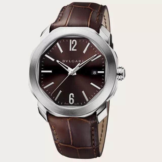 透过透明表底盖,可以欣赏到带有“BVLGARI”品牌标识的摆陀,防水深度可达50米。配备棕色鳄鱼皮表带,搭配精钢折叠式表扣,佩戴舒适安全。