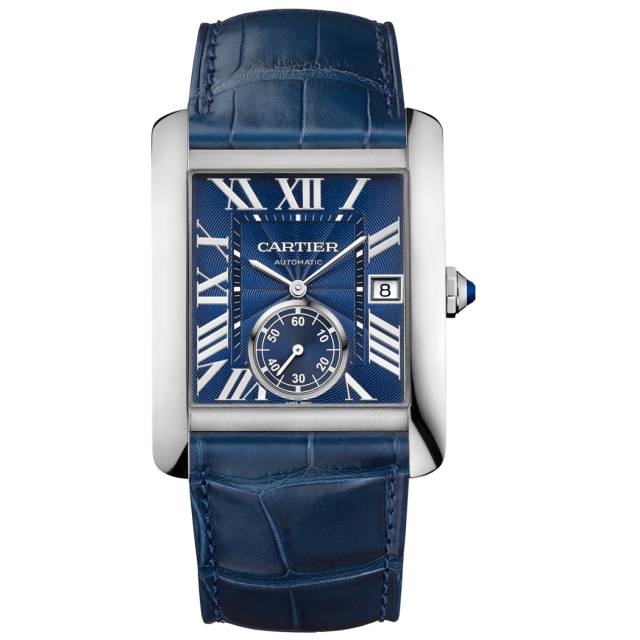 这款腕表表径34.3×44mm,厚9.5mm,大尺寸精钢表壳挥洒方形的恢弘气度,加之新增小秒针,绽放遒劲美感与优雅风范。精钢八角形表冠镶嵌一颗合成尖晶石,蓝色扭索雕纹表盘,配以剑形镀铑精钢指针。3时位置设日历显示窗,6时位置设小秒针表盘。