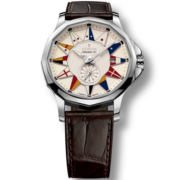 这款腕表表径42mm,厚9.5mm,沿用经典的12边形表圈设计,特大的彩色航海旗作为时间刻度,是向八、九十年代的旧款海军上将杯致敬。