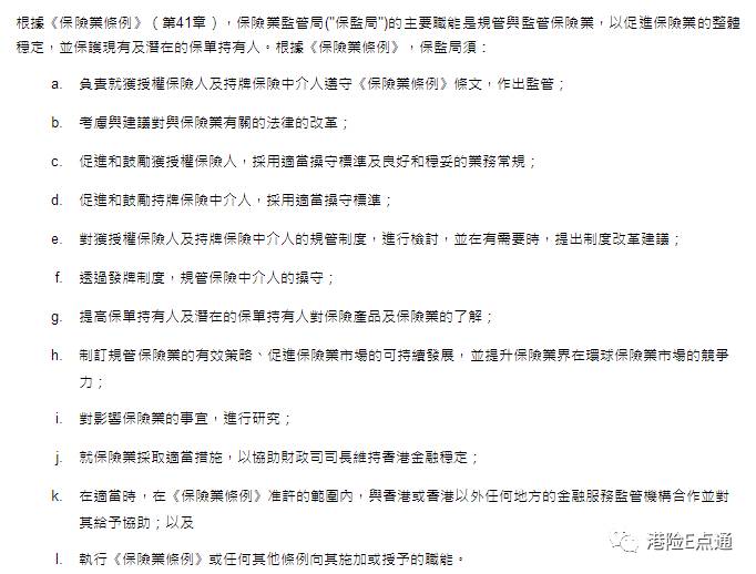 "保监局")是法定机构,成立的目的是执行《保险业条例》。根据《保险业条例》第4A(1)条,,以促进保险业的稳健发展及保障现时及潜在的保单持有人。在不限制第4A(1)条的一般性原则下,保监局拥有其他明确的法定职能。