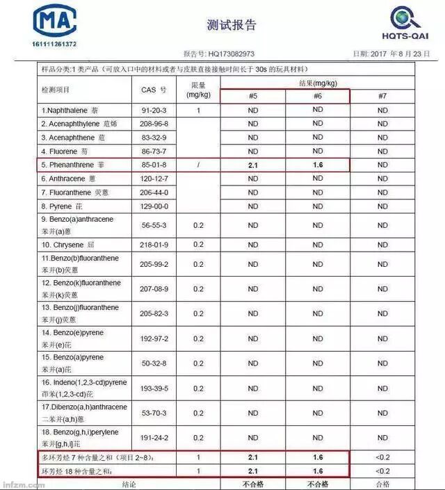 根据测评结果,1号样品儿童电话手表的SAR值(2.12W/kg)超过了我国对移动电话电磁辐射局部暴露限值(2.0W/kg);5和6号样品儿童电话手表的表带所含的多环芳烃(英文缩写为PAHs,一类致癌物质)超过了“欧盟的玩具标准EN71-3”,且“一个超标10倍,一个超标8倍”。