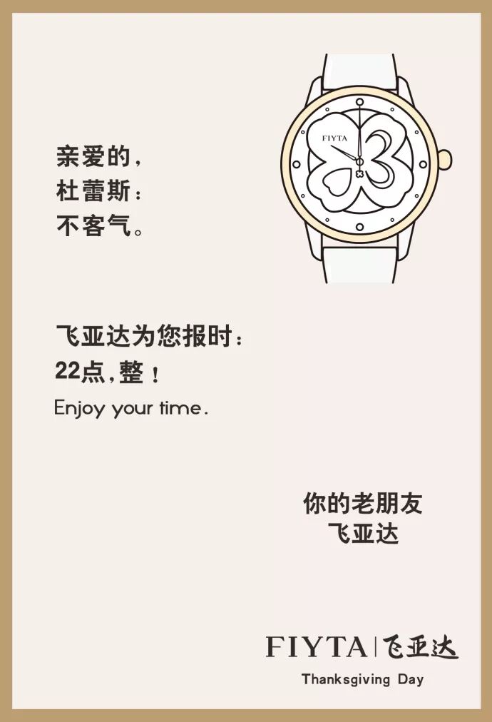 往年的感恩节,的文案足够精彩。今年更有意思,放了个大招,一口气调戏了十几个品牌。每小时推送一张海报,从上午10点开始,一直持续到晚上10点。非常持久,看得非常过瘾。