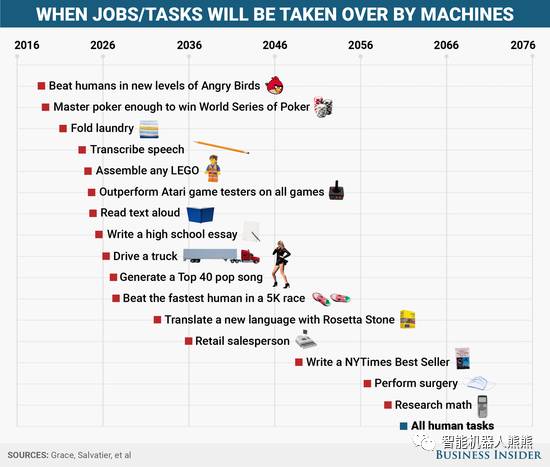 例如,预计到2024年,机器人在语言翻译方面就将超过人类;到2026年,机器人能够比人类写出更好的高中水平的论文。