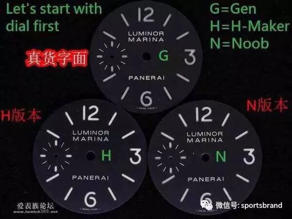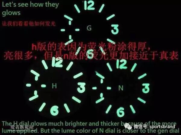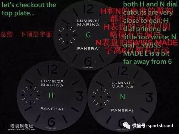 好玩的是,就算是仿货也有人仿,很多次等B货冒充n的名义在市面上以次充好。由于大量出口,所以N厂与真品和H厂三个版本的沛纳海,被国外玩家做了专业对比图,然后国内玩家发到了爱表族上。下面GEN代表真品,N代表N厂,H代表H厂。