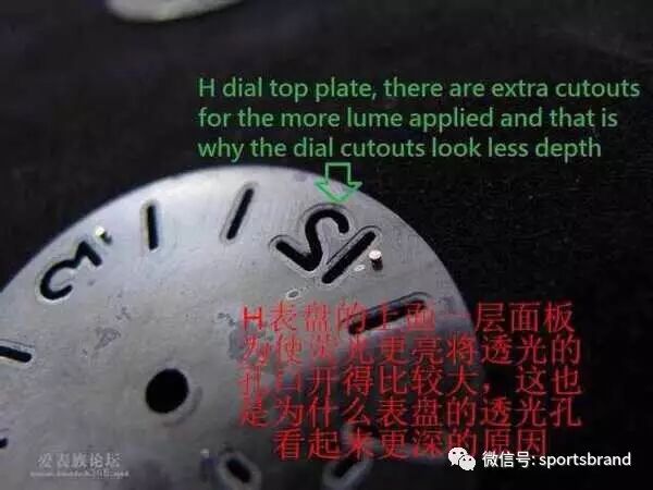 这里可以很明显看出区别,工艺上的不同造成的,显然N厂和正品几乎无差。下面可以看见颜色上明显的区别,原因是N厂在材料上下了苦功,用了正品一致的进口瑞士夜光粉。正品和n厂的发光颜色偏蓝,而且亮度的衰减度不同。看,细节决定成败。图片已经诠释出差距,N与H两个大厂之间的工艺差距尚且如此,何况小厂?都是下成本用真品开模。还是那句话,细节是魔鬼。 真正的复刻已经做的很棒,但是和正品在这种不起眼的细节上的细微差别也还是存在,只是不是专业用真品对比,根本无从分辨。虽然是在表壳内部看不见的细节,但是明显可以看出工艺上的差别,现在的中国顶尖仿表已经在追求极致,精益求精。每一个零件的细节都值得细细对比,这才是专业精神,诠释完美复刻。