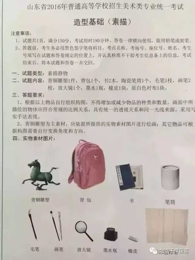 素描考题:篮球一个,石膏体一个,木质人物模型一个,跳绳一根,魔方一个,绘画颜料一瓶,绘画颜料两支,白色衬布一块。