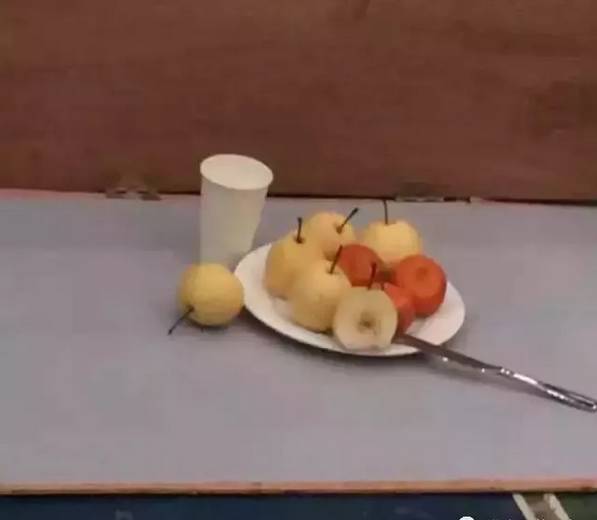 色彩考题:色彩静物默写,一块绿灰色的衬布上放一瓶可乐(大瓶),白瓷盘一个,盘内面包三片,不锈钢水果刀一把,鲜橙汁一杯,苹果三个,另加白色衬布一块
