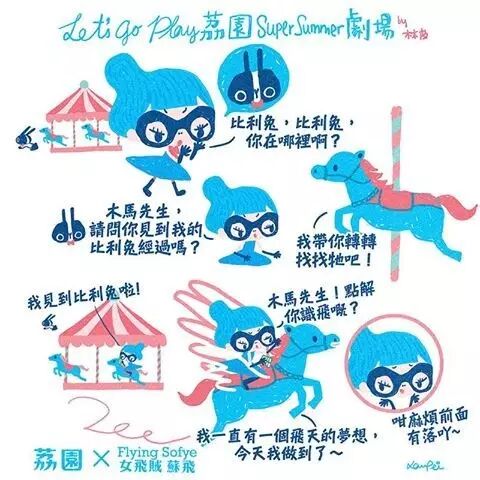 这个活动就像香港其他的嘉年华一样,绝不马虎,每个环节都是活动方精心设计的!这次“荔园·夏日大晒”这个活动里,就有一个充满心思的角色——“女飞贼苏菲”。她是荔园与香港著名插画师林皮携手合作的杰作,她将会带着大家在荔园里游玩,找宝物、寻迷宫,真是“得意到飞起”。