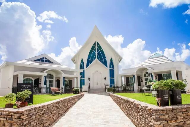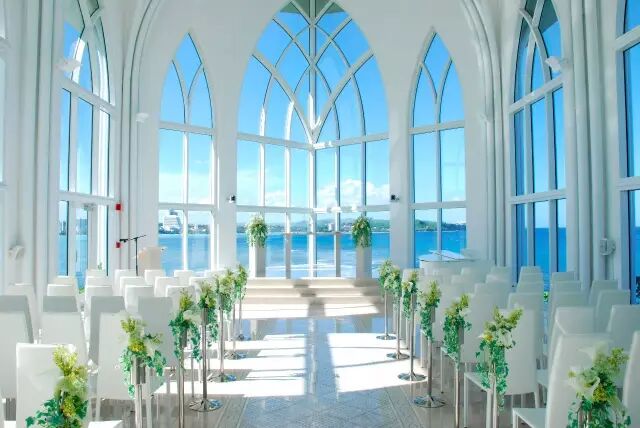 ▲水晶教堂大胆采用了哥特式的建筑风格,可以270°尽览杜梦湾的海景,向北仰望就是情人崖,教堂以白色大理石与蓝色彩绘玻璃窗为主体,摆放了白色钢琴、白色嘉宾座椅、素雅的鲜花等布置,尽显浪漫与圣洁。