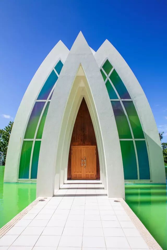 ▲彩虹教堂融合柔美的“水”与广阔的海天之景,就像一道彩虹横跨在海上,恋人在这里留影或举办婚礼,就如被天地自然万物祝福和拥抱,爱情,可以像童话般的美好。