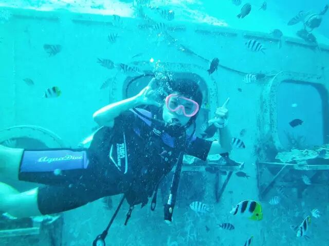 而花花就选择了深潜,在海洋公园海底与鱼群、海龟共游,还在展望台舱外和舱内的孩子们挥手“Hafa Adai”(密克罗尼西亚群岛人表示“你好”的手势),哈哈!