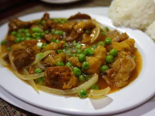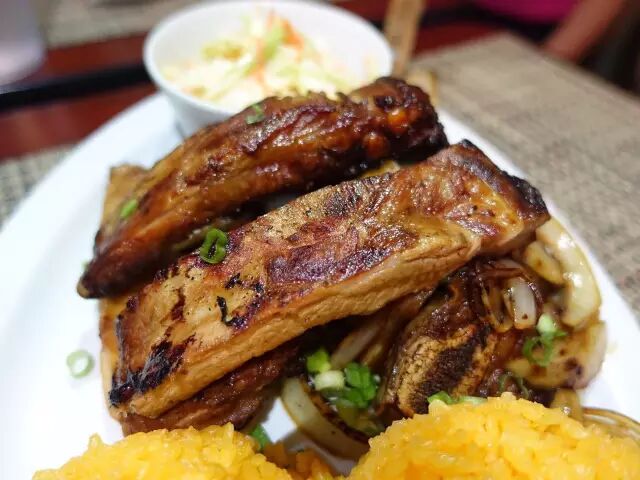 【3】查莫洛烤肋排——先将肋排和酱汁混合浸至入味,然后放在木炭架上烤熟,再加上葱花、洋葱粒,热辣上桌,香气立即四溢,咬下去口感香嫩,肉汁渗入口腔各处欢闹,!