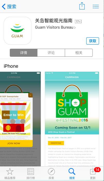 下载“关岛智能观光指南”APP后,走到各商场合作商户附近时就能收到定位通知,提醒附近商店内可以享受的各种APP优惠!