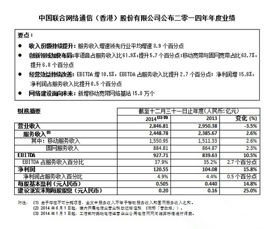 (二零一五年三月三日,香港) – 中国联合网络通信(香港)股份有限公司(「中国联通」或「本公司」) (香港联交所编号: 0762、纽约证交所编号:CHU)今天欣然公布截至二零一四年十二月三十一日止之年度业绩。