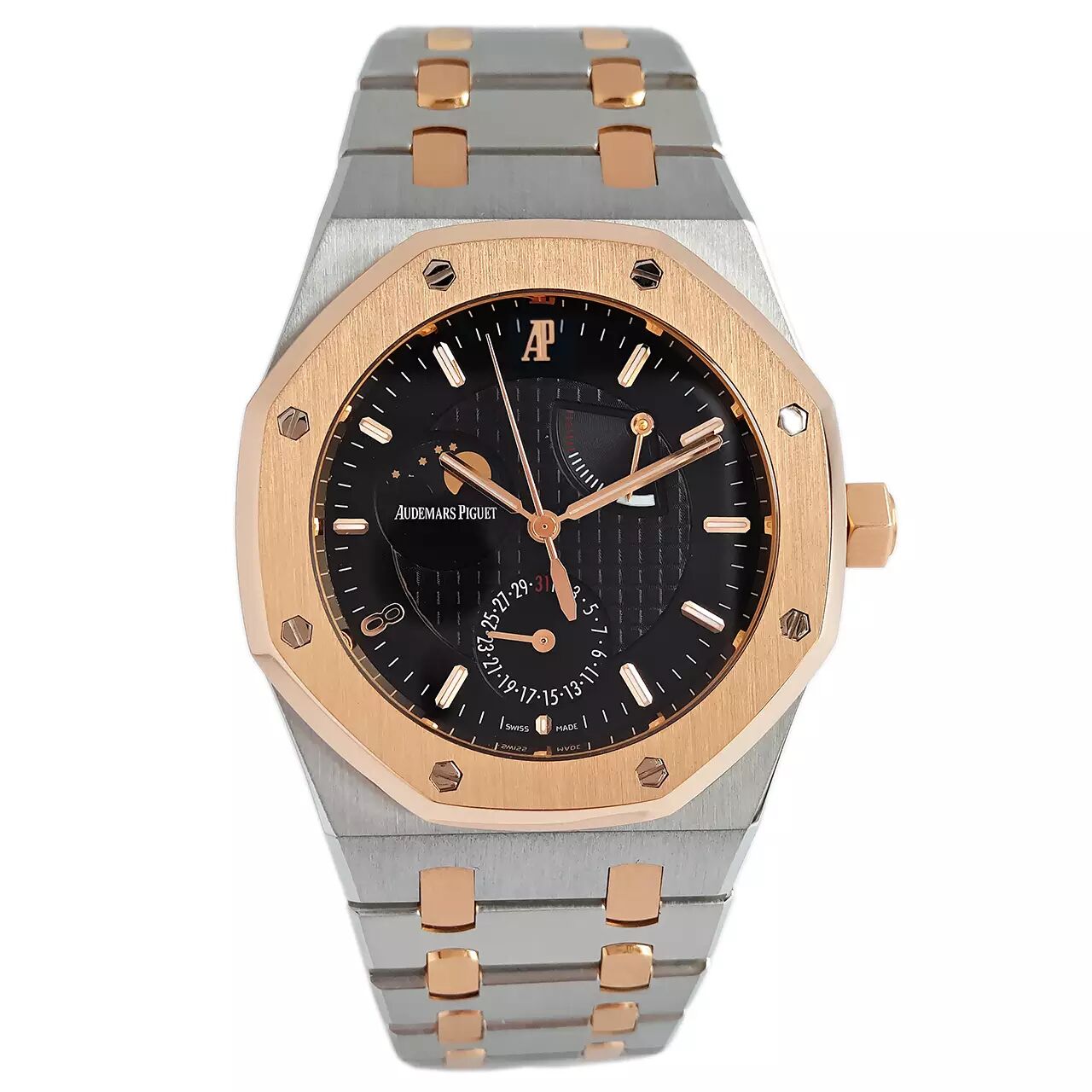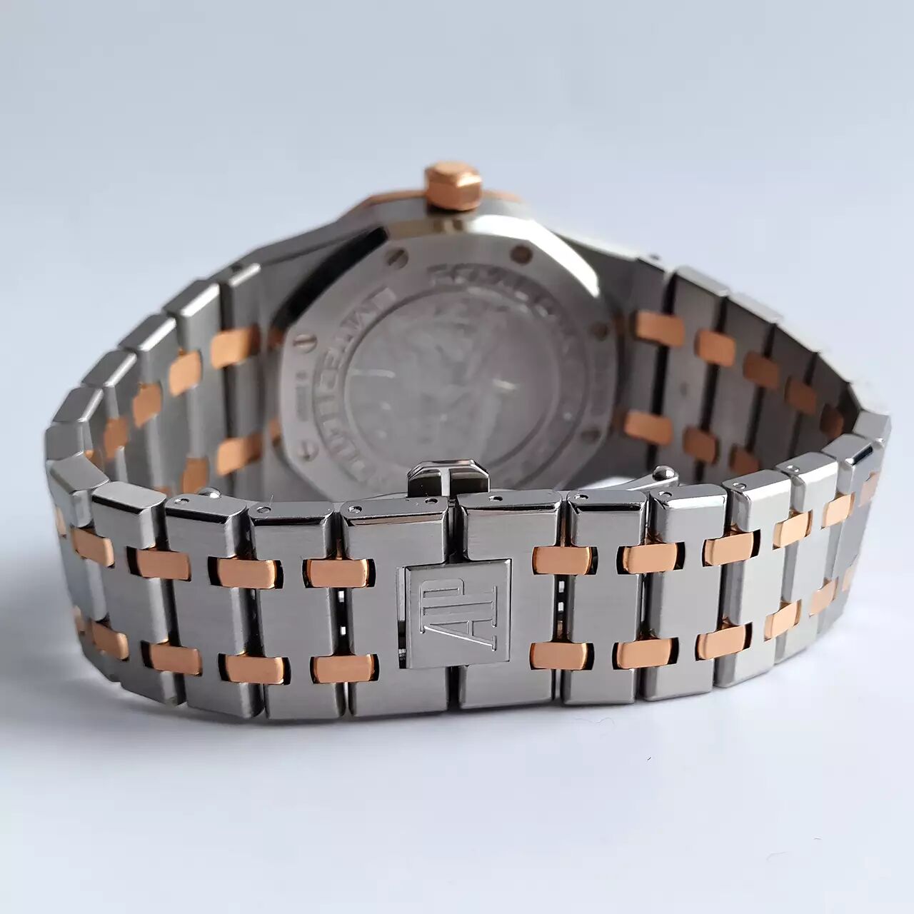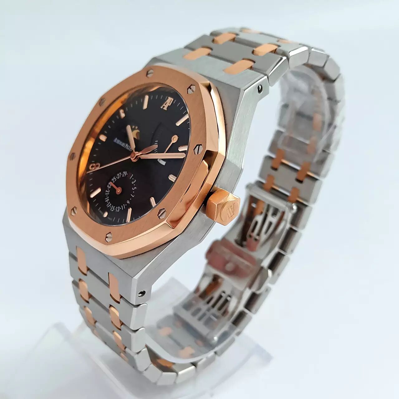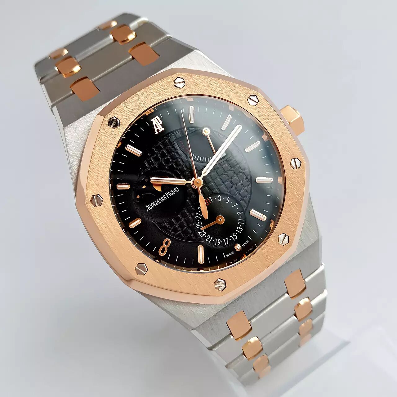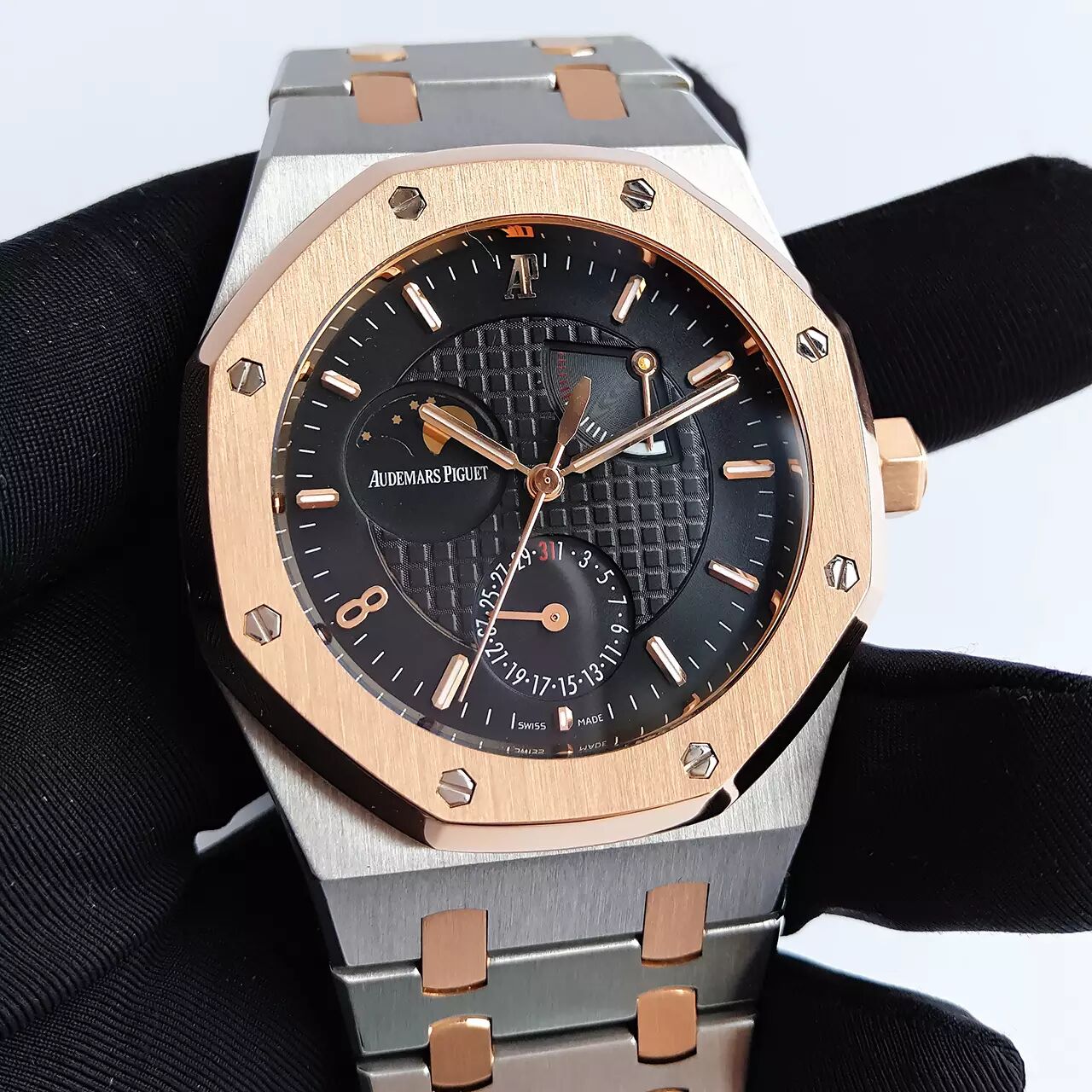 AP爱彼间玫瑰金黑盘中国骄傲皇家橡树限量版机械男士腕表。型号:26168SR.00.1220SR.01,此款腕表是爱彼表特别为中国市场推出皇家橡树Pride of China日期月相自动表,专门选用了中国万里长城镌刻于表背,极具中国特色,值得珍藏。39MM表径,金色处皆为18K玫瑰金材质,黑色马赛克表盘,夜光条刻度+指针,在八点位置上采用数字“8”,充分体现了“8”这个数字对于中国人所蕴含吉祥如意的寓意。八角表盘由18K白金螺丝固定。搭载Cal. 3123/3909自动上弦机芯,1点位置动力显示,6点位置日历盘显示,9点位置月相显示。间金表链,A P字样折叠扣,夜光凌厉!黑盘款全球限量250块,此为第24块。
