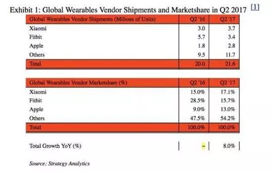 在今年8月份,市场研究机构Strategy Analytics公布了第二季度全球可穿戴设备的出货量排名,小米凭借370万的销量位列第一,力压340万台的Fitbit一头,苹果则凭借280万台的销量排在了第三。