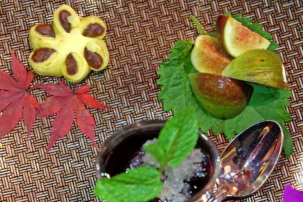 薄荷燕窝芦荟洛神花茶冻、枣泥菊花酥、时令水果