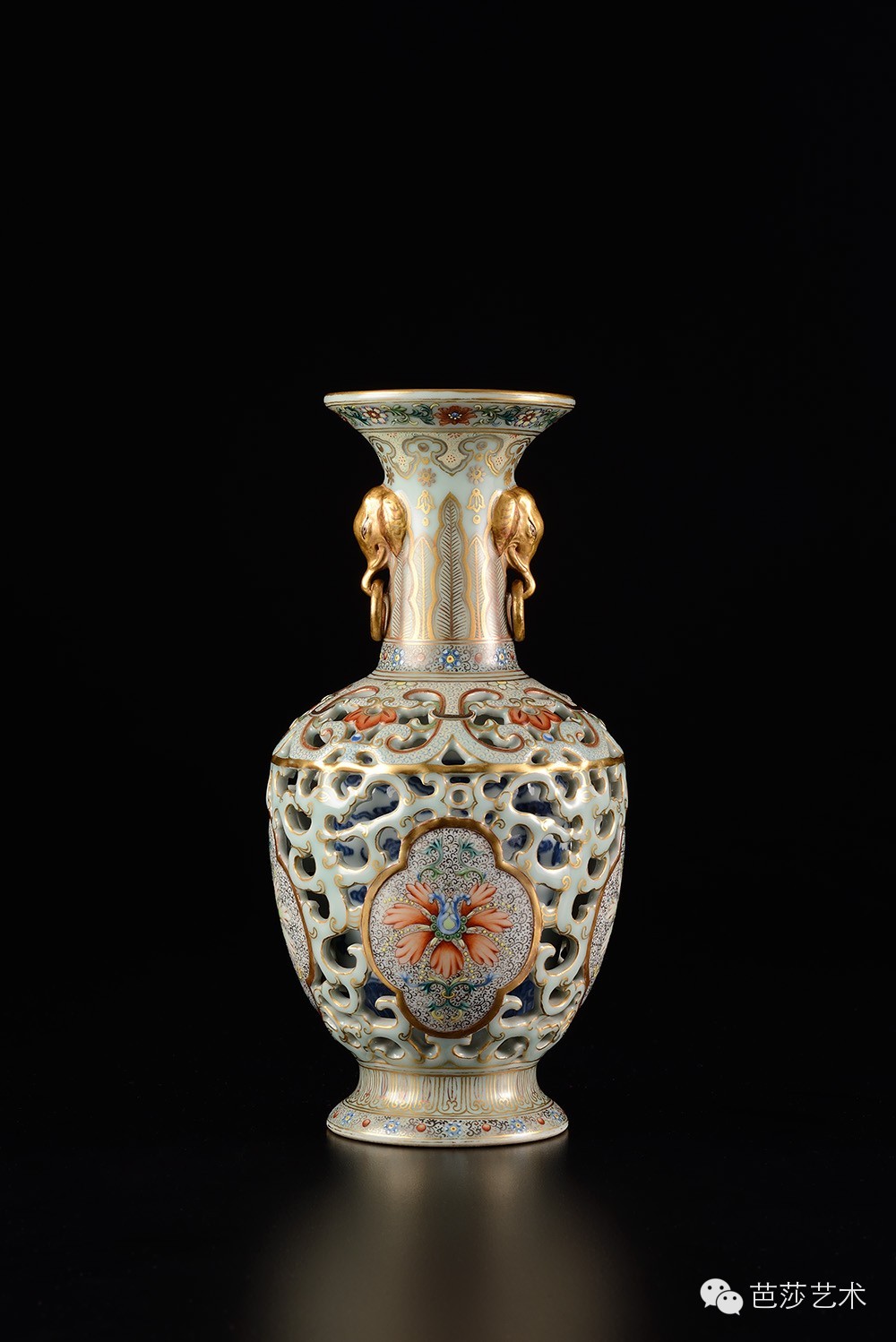清乾隆 冬青釉洋彩描金夔龙忍冬纹内青花云蝠双象耳套瓶,“大清乾隆年制”六字篆书款,高 23.2cm,估价待询