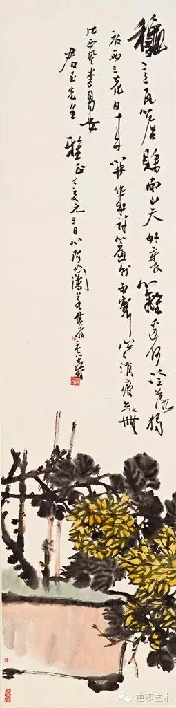 潘天寿《冷香菊艳图》,设色纸本立轴,136 x 34cm,1947年