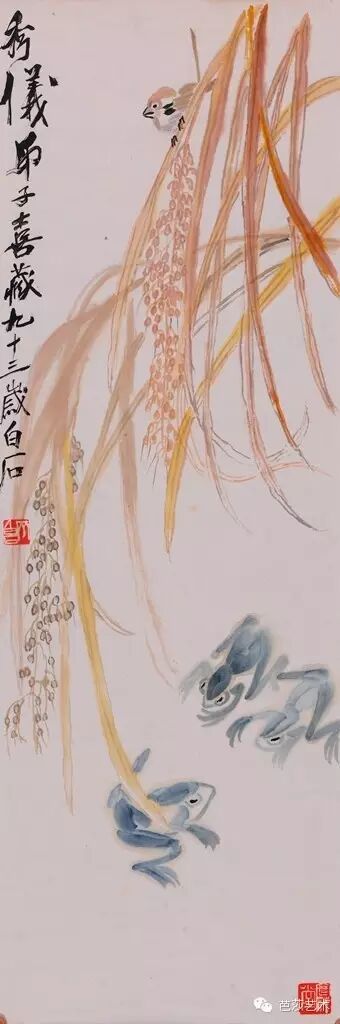 齐白石《丰年重鸣》,设色纸本立轴,100 x 34cm,1953年,估价:HK$1,000,000-2,000,000 US$128,900-257,700