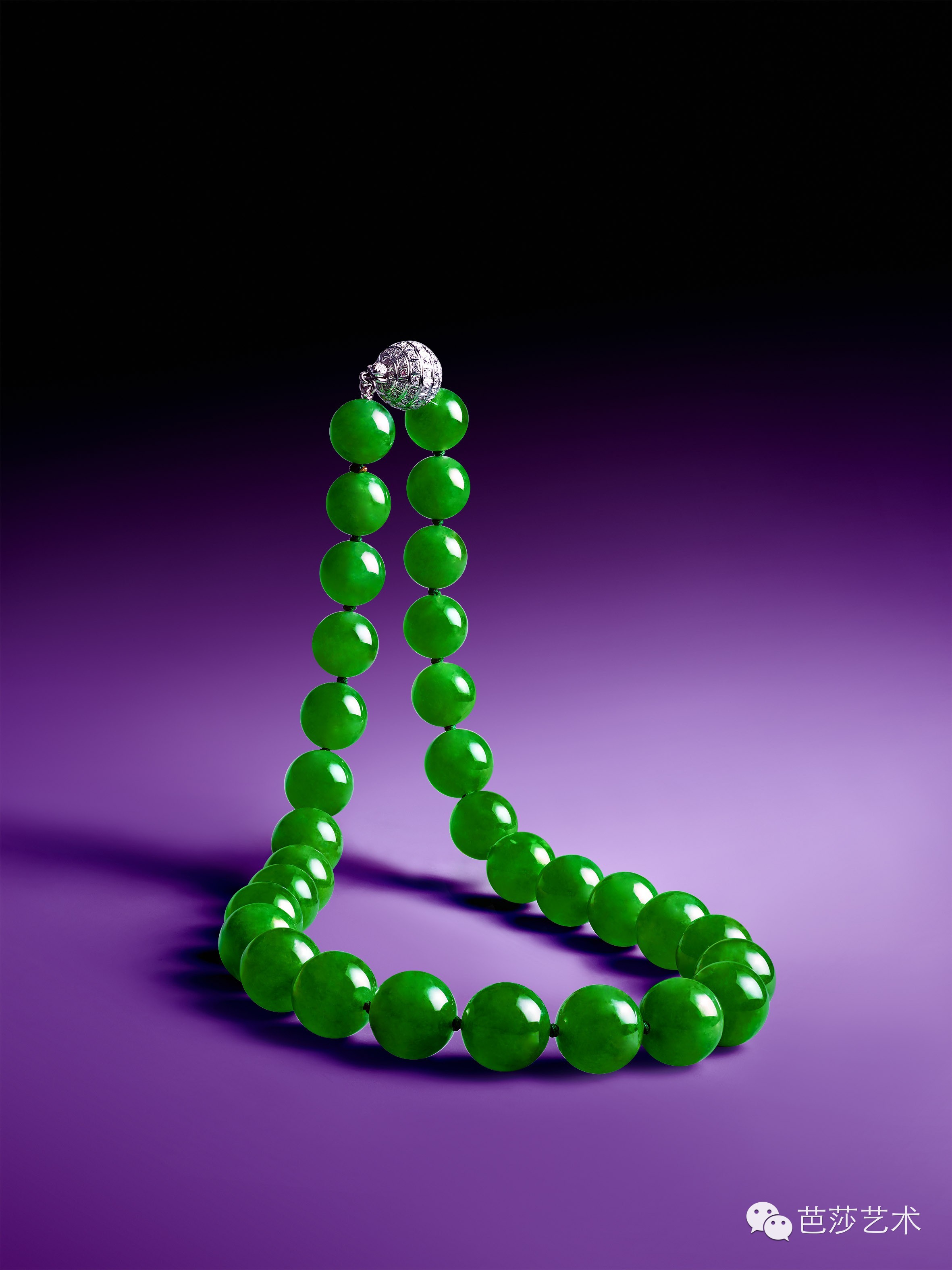 缅甸天然翡翠配钻石项链,估价待询,珠链由31颗缅翡天然翡翠珠串联而成,配18K金镶钻石,最大翡翠珠子尺寸约15.82mm,颈链长约52cm,附香港玉石鉴定中心证书