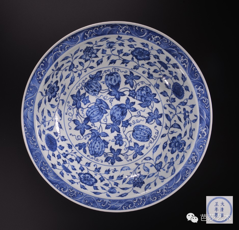清雍正 青花花果瓜藤纹大盘,“大清雍正年制”六字双行楷书款,高9.5cm,直径 45.5cm