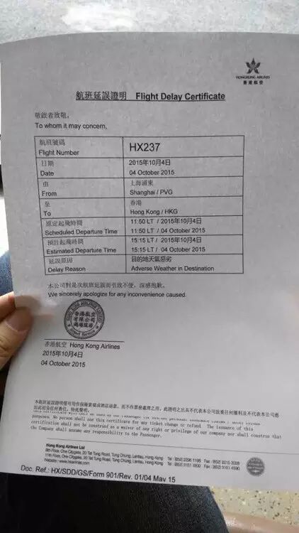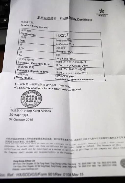 大家都领到了延误证明,上面写着15点15分预计起飞。