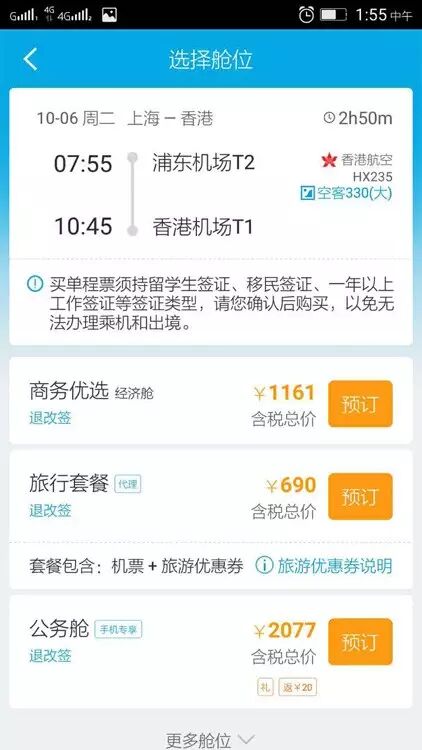 同样的,港龙可至少2000元朝上的价位。东航价格在1200元左右。