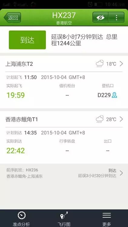 先说10月4日的香港航空HX237航班。11点50分应该从上海起飞,但直到下午2点多,执行航班的飞机才刚到上海浦东机场。
