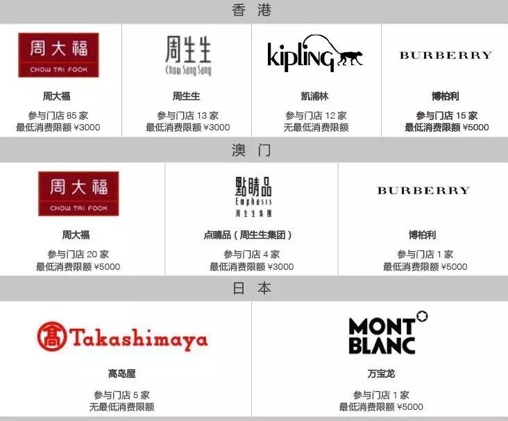 我拿HK举例,参与10%的返现的商户有周大福、英皇钟表珠宝、POLO、谢瑞麟、TUMI等等等等,请原谅我实在是不太熟悉牌子。
