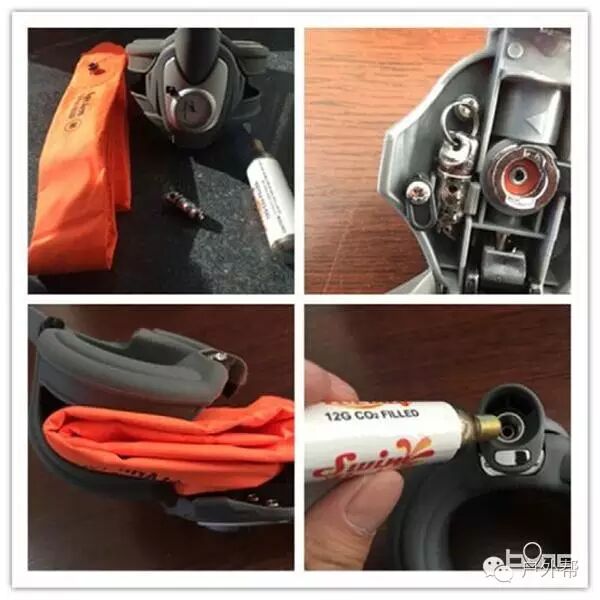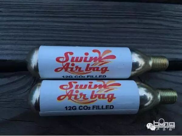 两瓶装着CO2气体的充气瓶,螺丝式的设计,在我们需要参与涉水活动之前,要把充气瓶拧在护腕主体上面。