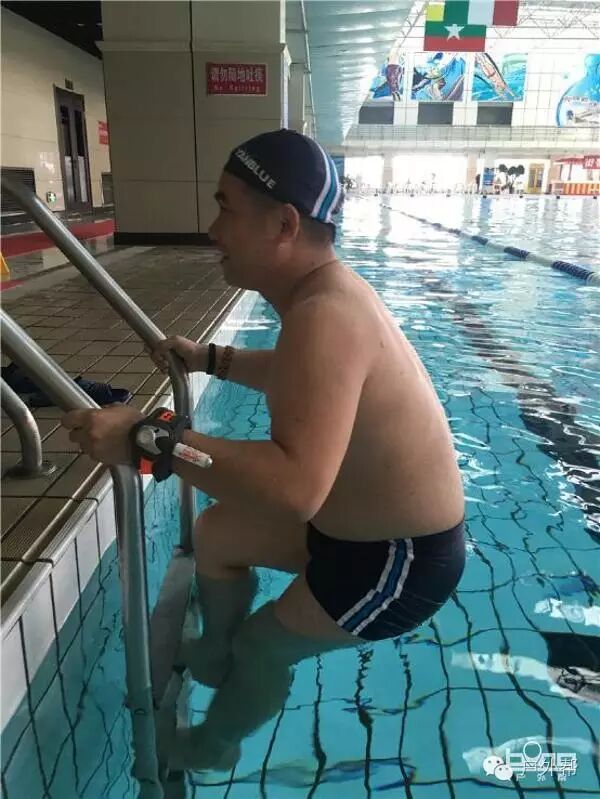 最后,拧上充气瓶就安装完毕了。来到游泳池,先做个泳前运动,热下身准备下水。