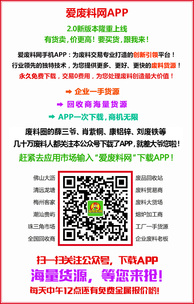 关注爱废料网公众号和下载爱废料网APP,随时可以关注到大量的废料现货货源,免费下载,交易0费用!APP就是所有废料人的生意好帮手,赶紧去应该市场输入“爱废料网”下载APP,一次下载,商机无限!