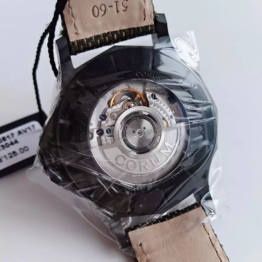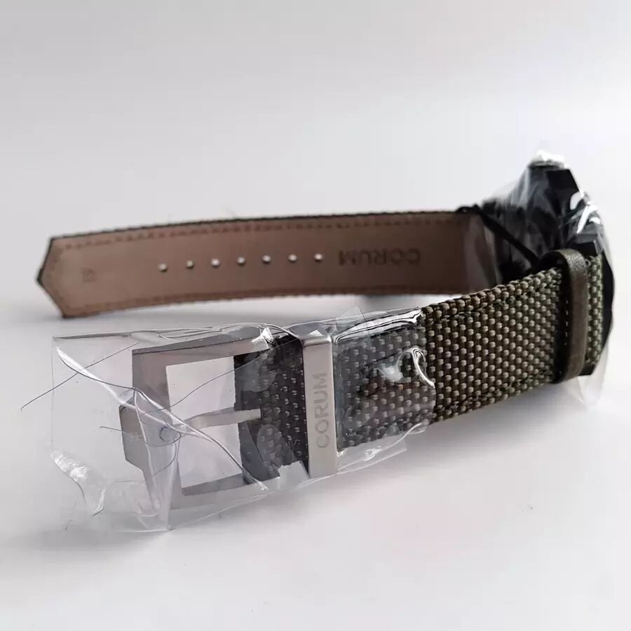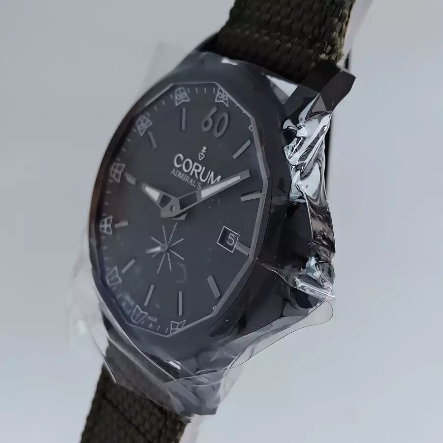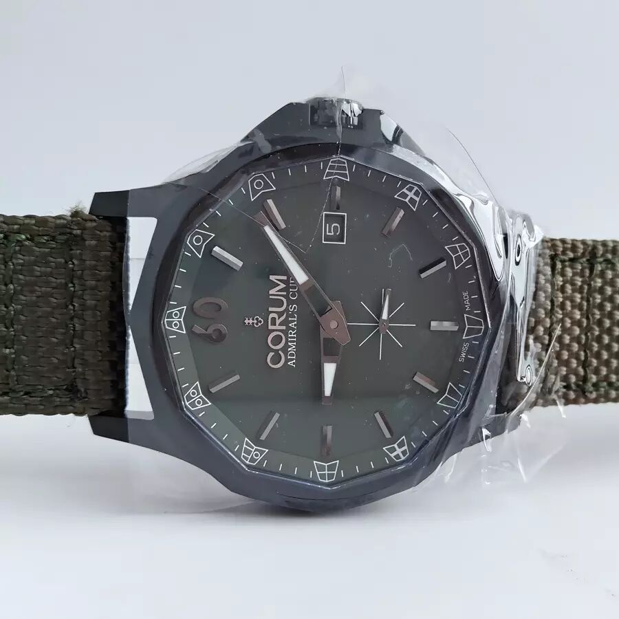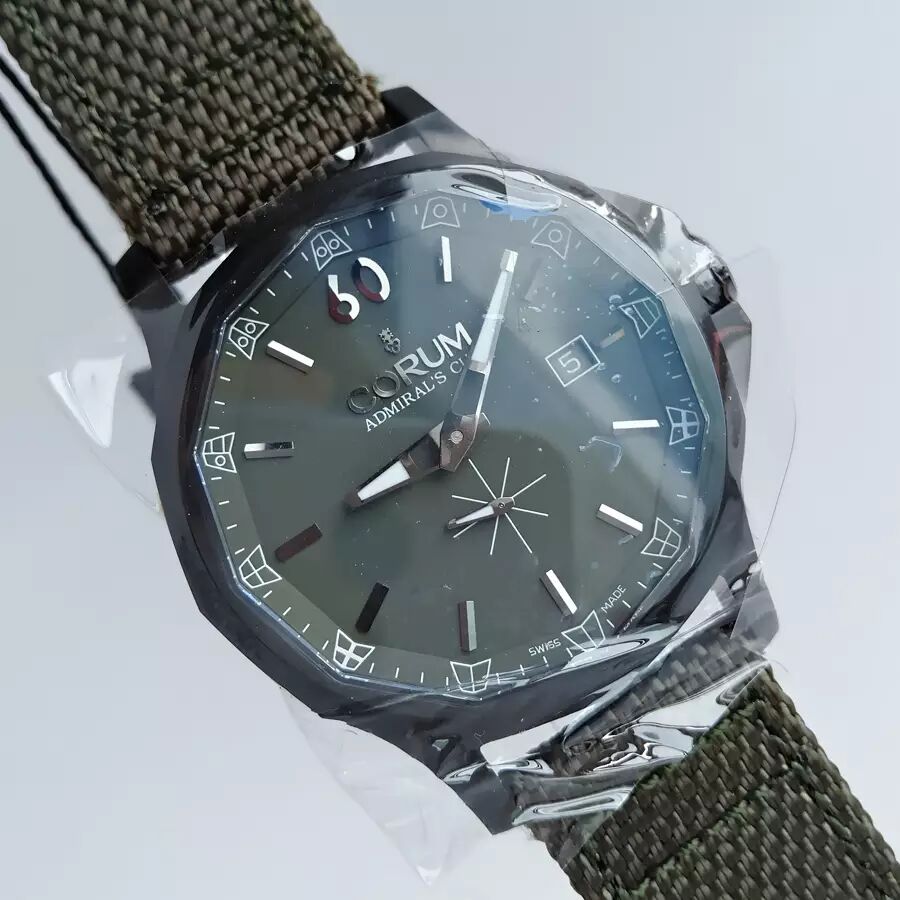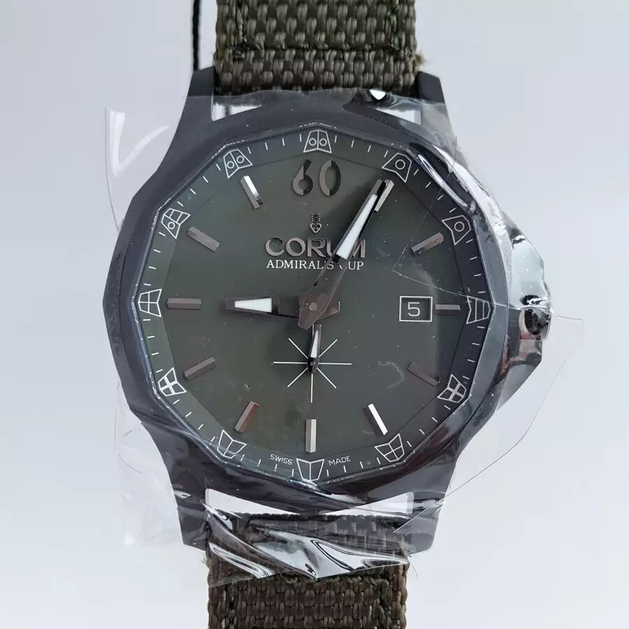 Corum昆仑Admiral's Cup海军上将杯系列小三针男士腕表。型号:395.107.98/0617 AV17(黑钢灰盘)整表全部精钢打造,42MM大表径,型男首选,硬汉必备!立体钉条刻度+太子妃形指针,12边拱形表壳及刻度位置上的十二面航海旗,是海军上将独有的典型标志,双层镀膜蓝宝石水晶镜面及底镜,妖艳蓝光,摄人心魄!精打磨背透昆仑自厂自动机械机芯(这年头自厂芯就是高价的代名词,更何况是名表海军上将)!在腕表表冠两侧设有一对表冠护肩,坚固耐用防撞击。3点位置日历窗口显示,户外运动编织表带搭配针扣,笔直未穿孔,夜光凌厉~!