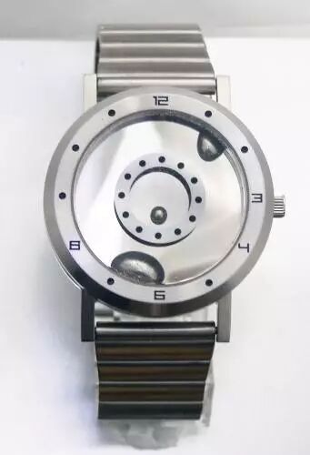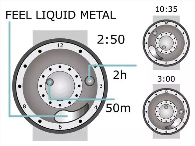 只是…看到這特別的 LM watch,比較好奇的應該顯示時間的方式,它利用小磁石吸引金屬顯示時間,手錶裡滑動的金屬可以分成三大部分:大圓的金屬圓點是時針、小圓裡的金屬代表分針,另外還有部分液態金屬會在手錶底部跑來跑去。