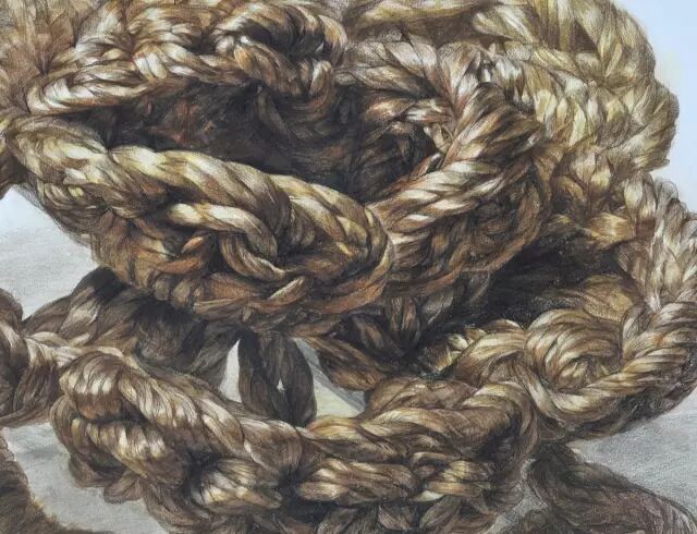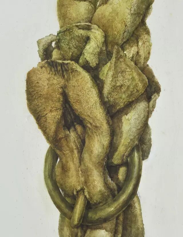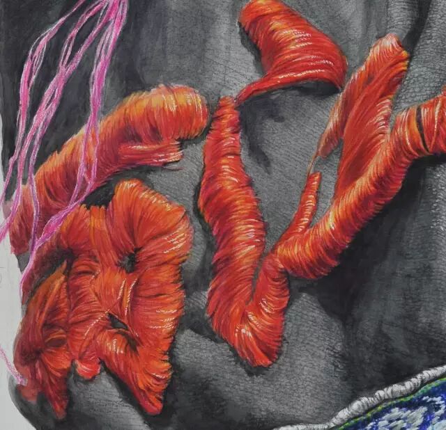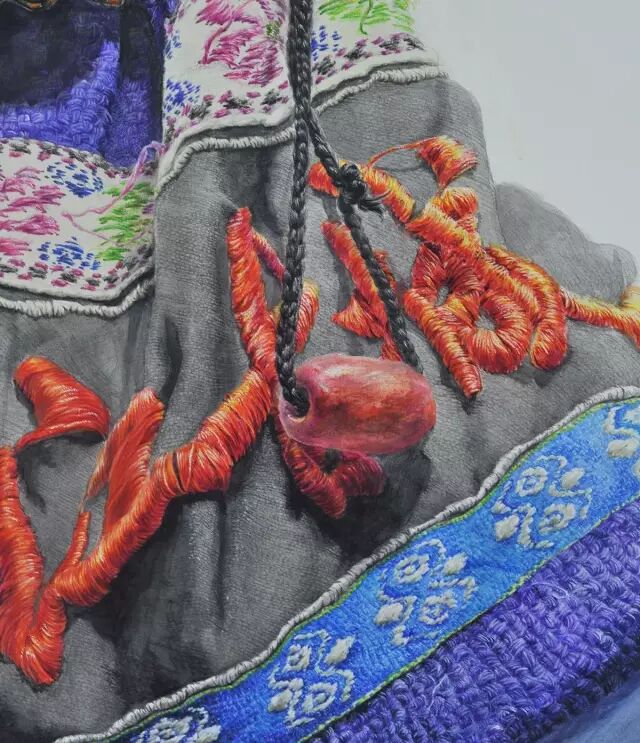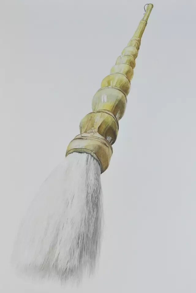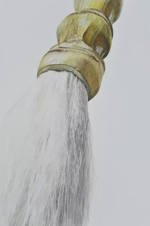在参观了宣笔的制作过程和成品之后,我被这支由罗汉竹和兔毛制作的毛笔吸引了,这只毛笔造型很独特美观,用于精微素描刻画性很强,于是我毫不犹豫的买下了它。在学校经过对其笔毛和笔杆的材质研究后,我找到了对其刻画的最佳方法。经过制作绘本与画大画的数月时间,我完成了这幅作品。