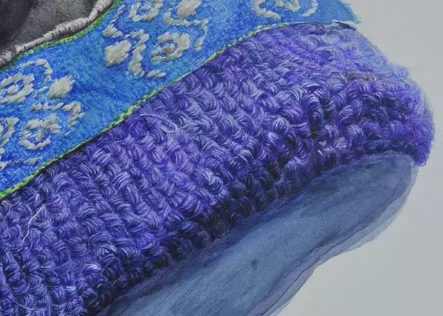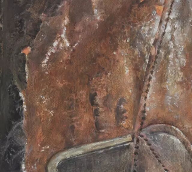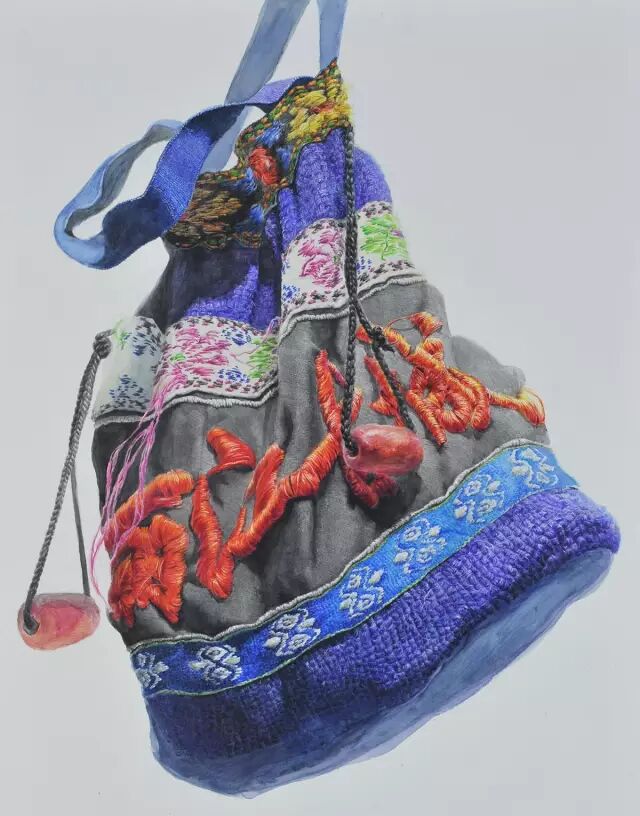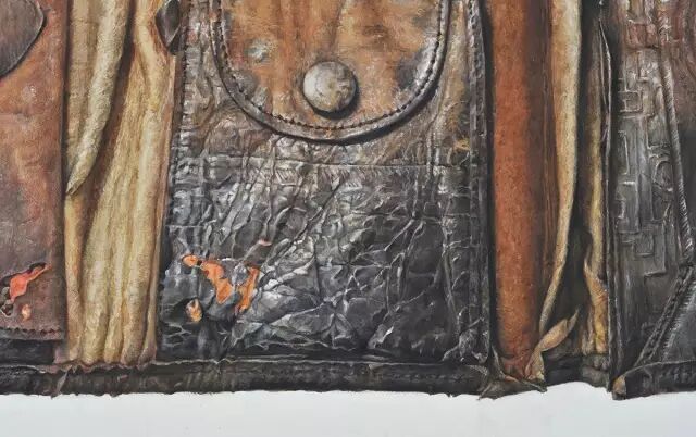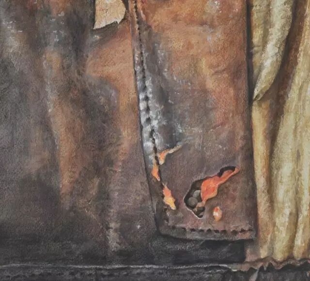 可能也是冥冥之中的缘分吧,当我见到那个古老的手工皮包时,脑中便浮现出一副古老的街景:她静静的躺在集市上,等着人来带走它,我便选择了这个静物。开始作画后,我愈发的爱她,她就静静的躺在那,这个静物就是我的世界,传统和美在她身上体现的淋漓尽致。让我奋不顾身的陷入了与她共处的世界里。这便是我与这个静物的故事。
