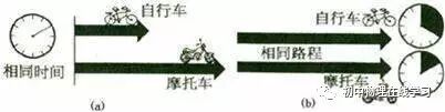 9、如图中(a)、(b)两图分别表示比较自行车和摩托车运动快慢的两种方法.
