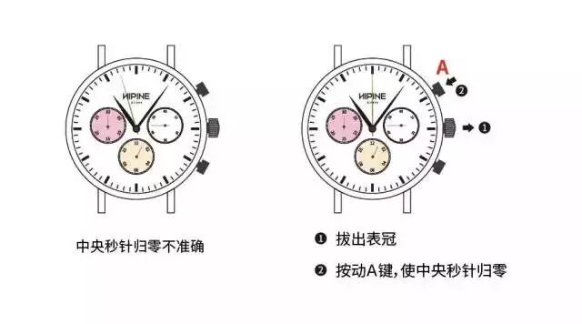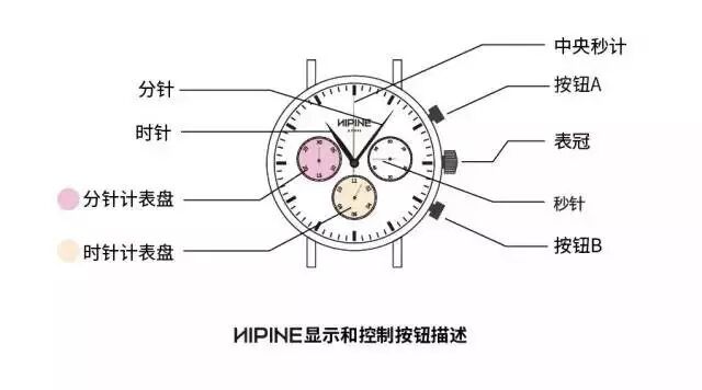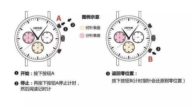 三眼手表调时的方法很简单,不同款式的三眼表,它们的调时方法都大同小异。,在平时处于静止状态,可以自由控制。按A键是开始/暂停键,,再按一下A键计时暂停。然后按B键,所有指针归零。左上角的小表盘是30分钟计时,,,那个指针走1格;,30分钟的指针走2圈。右上角的小表盘是恒动秒表,和计时装置无关,无论计时装置是否启动,此针都在运转。最下面的小表盘为12小时计时,,该指针走动1格。